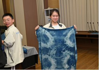 非遗植物染是我校的非遗特色课程。在欧亚梅老师的指导下,学生们以天然植物蓝染原料为笔,在织物上染制出青绿山水与江汉繁花。课程采用审美感知、艺术表现、文化理解、创意实践,从色彩哲学、纹样设计和扎染技法的艺术表现理解荆楚文化基因,创作出兼具传统韵味与现代审美的作品。当香港学生林雅雯展示自己用植物蓝染丝巾时,传统工艺与现代创意的碰撞分外精彩。