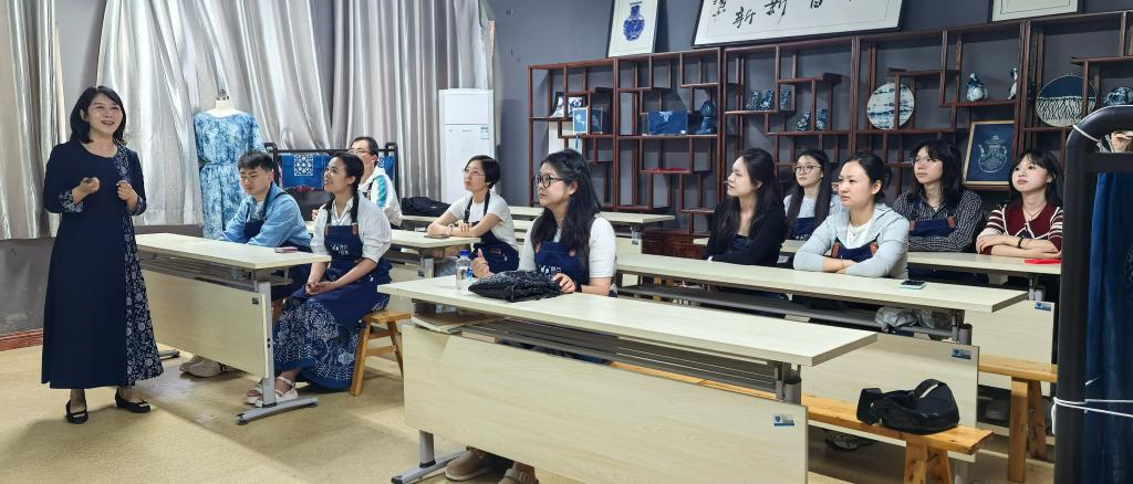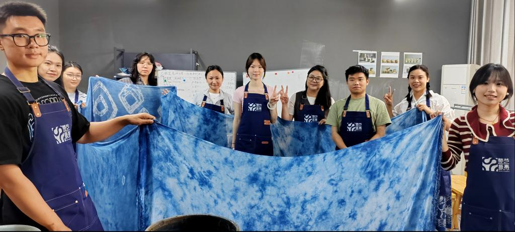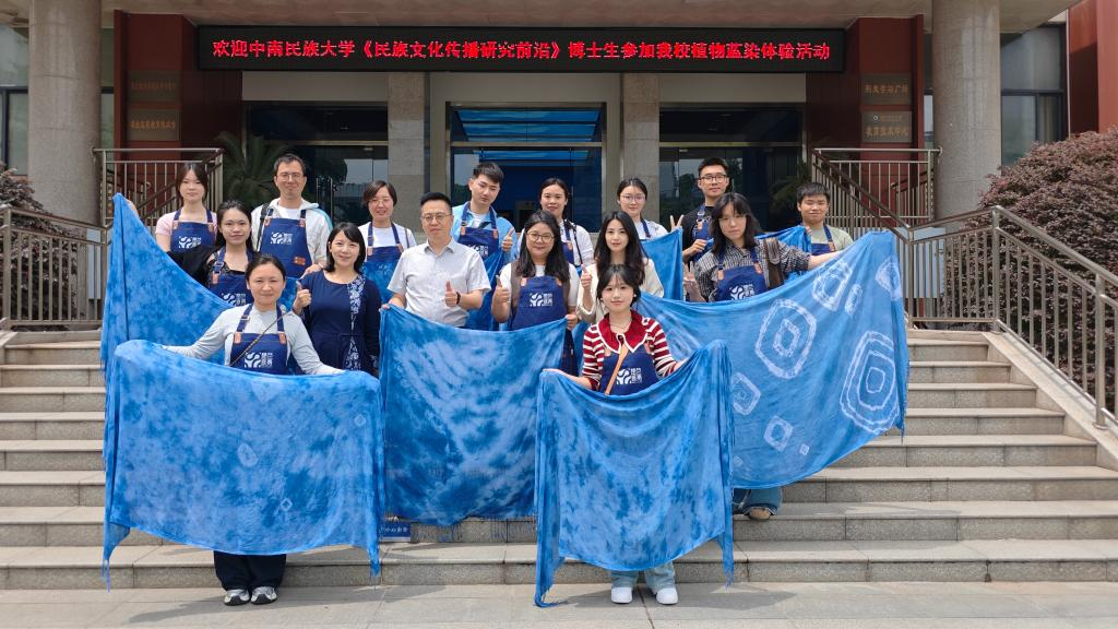 学术殿堂里的非遗之光。4月23日,当中南民族大学文学院副院长陈俊峻教授带领的博士团队步入正在建设的非遗展厅时,一场关于文化基因解码的对话就此展开。从武汉剪纸的纹样流变到植物染料的科学萃取,博士生与我校研究团队围绕“非遗活态传承的当代路径”展开深度研讨。在非遗蓝染工坊,我校欧亚梅老师的专题教学课将学术思辨引向实践场域。博士生们褪去学术长袍,执起染缸中的布匹,通过浸染、氧化、固色等工序,让古籍中的文字记载转化为具象的靛蓝纹样。这种“学术+技艺”的跨界体验,为双方后续联合申报的荆楚非遗口述史研究项目注入鲜活注脚。“非遗传承既要守得住老手艺,更要讲得出新故事。”我校发展规划处负责人表示,该场活动从实践创新与学术研究维度,印证了职业院校与本科高校协同育人的可能性。