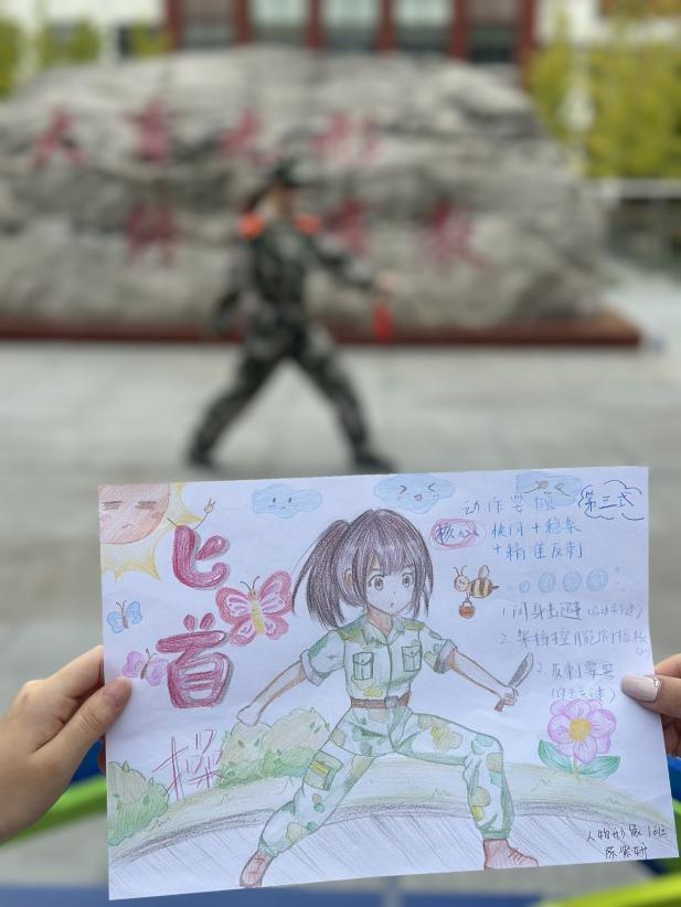 创意图说:艺术生的军训叙事。“光用眼睛记不够,我要把大家训练的样子画下来!” 为了让军训记忆更鲜活,学院发起的 “图说军训” 活动,成了艺创学子发挥专业特长的 “舞台”。他们拿起画笔、举起相机、打开设计软件,以独特的艺术视角,记录下匕首操训练中的每一个精彩瞬间。25级艺术设计专业陈同学的速写本上,将匕首操的标准动作拆解成手绘插画,标注动作要领,既美观又实用,成了训练场上的“小教具”。