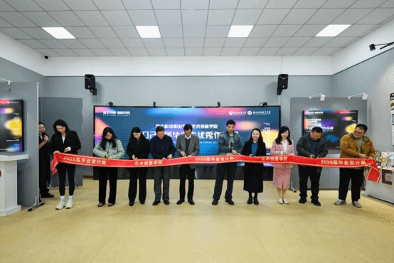校领导和校企嘉宾共同上台为毕业生优秀作品展剪彩,宣布2026届毕业生优秀作品展正式开幕。