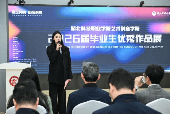 夏学文以“一瓶水的创意包装设计”为切入点,充分肯定艺术创意学院在艺术类高技能人才培养上的探索成效,赞扬其“艺术与科技融合、传承与创新并重”的实践成果。他表示,本次展览不仅是毕业生三年学业成果的集中展示,更是学校服务地方文化创意产业、推动楚文化在数字时代活化传承的重要窗口,希望同学们继续在未来的艺术道路上勇毅前行。