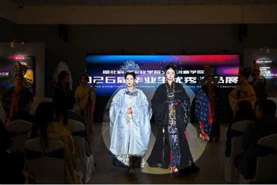 开幕式在人物形象设计专业学子带来的中国传统服饰创意走秀中拉开帷幕。模特们身着自己亲手制作的中式传统服饰,既有对传统文化的致敬,也融入了现代审美的解构与重塑。古典的雅致气韵与前卫的时尚张力在此刻交汇,现场掌声雷动,瞬间点燃展览氛围。