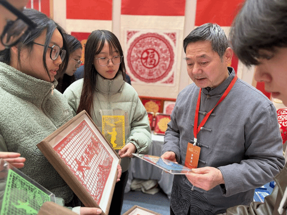 在展览现场,我校文创作品还得到了武汉剪纸省级代表性传承人沈松柏老师的悉心指导。作为深耕剪纸艺术数十年的非遗大师,沈松柏老师将武汉剪纸“金纸刻制、彩纸衬色”的传统技艺精髓,与太乙五行拳文创的设计理念相结合,提出了诸多兼具艺术性与实用性的修改建议,助力作品实现传统武术与剪纸艺术的跨界融合。沈松柏老师对我校团队的创新尝试给予高度肯定,认为这种跨界创作既保留了非遗的文化根脉,又赋予了其新时代的表达,为非遗活化提供了新思路。